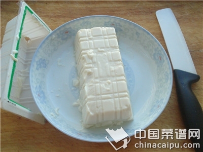 2.刚买回来的豆腐水分较多,可以用稍重的物体放在盘子里,然后压在豆腐上面30分钟左右,把豆腐里的水压出来,然后进行烹饪,豆腐更容易入味。
