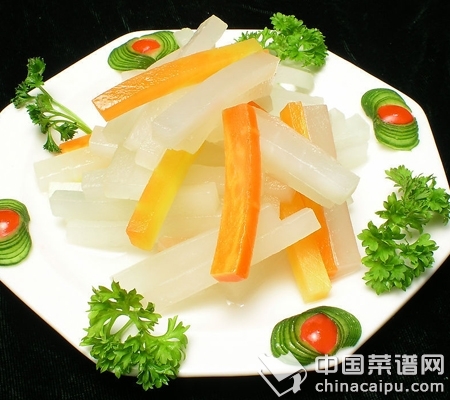 4、将白菜心和萝卜切成细丝,加醋、糖拌匀后食用,清凉解酒。
