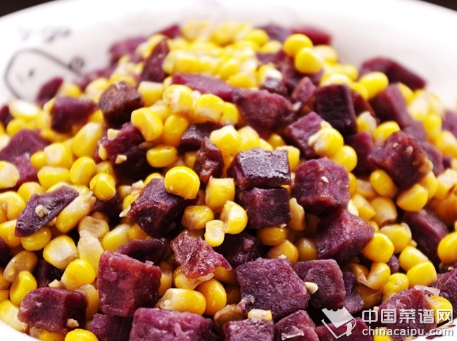 2、做法:紫薯去皮切成丁,玉米剥粒,在热油锅中炒紫薯,变色后加入玉米粒,继续翻炒,断生之后加入盐、糖调味后就可以出锅了。
