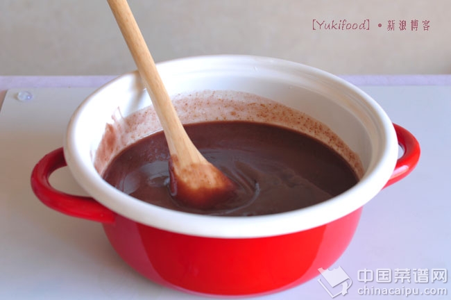 2.红豆沙糊降温时,可将其倒在不锈钢材质的容器中,隔着冰水降温。因为不锈钢能够快速地传导温度,搅拌两分钟后即可降温。