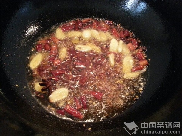 3.出辣味和麻味后,放入姜蒜片,泡椒,泡姜(葱先不要放)。