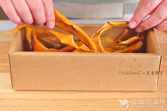 6.准备一个纸盒子,铺一层已经晒干的柿子皮,码上晒好的软硬适中、表皮弹性十足的柿子,表面再铺一层干柿子皮,盖盖儿密封起来,静置25-30天,待柿子饼表面渗出白色的粉霜时就可以食用了。