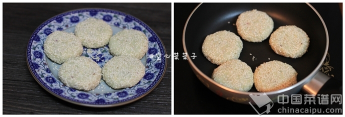 5. 山药饼压扁后,干锅,中小火焙香,中途需移动和翻面,以免焙焦,山药和山楂本身都是熟的,所以芝麻出香味,表面略呈黄色就可以了。