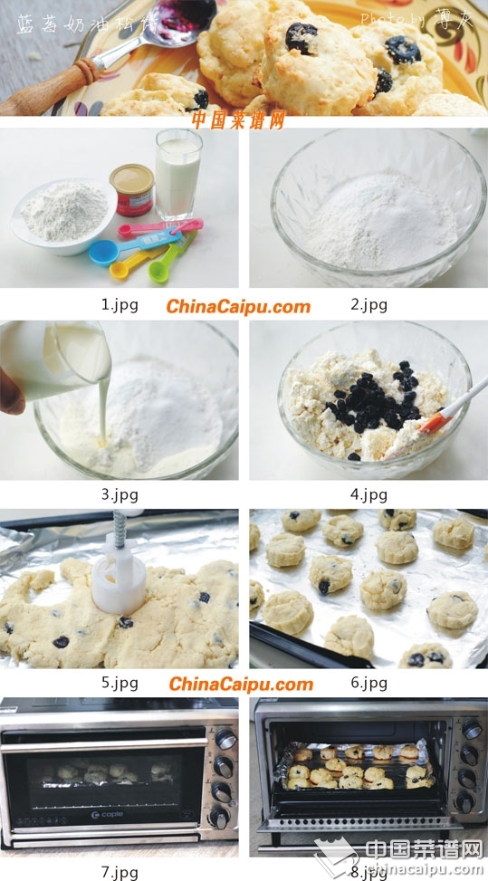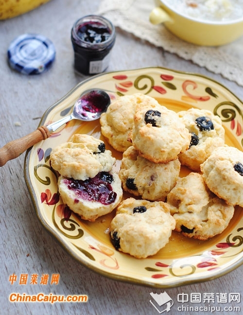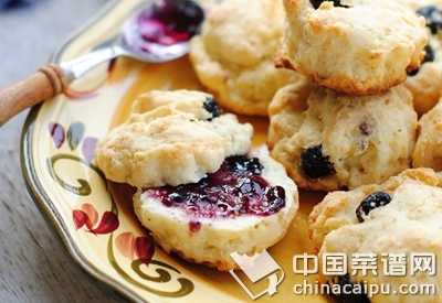面粉240克(2cups)、奶油190克(1+1/4cups)、糖20克、蓝莓果干50克、泡打粉8克(1tbsp)、盐3克(1/2tsp)