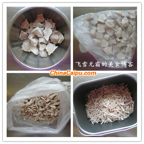 8、然后倒入面包机中,感觉撕的太细了,到面包机中很快就被打散。下次做的时候,可以不用撕这么细。