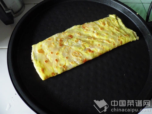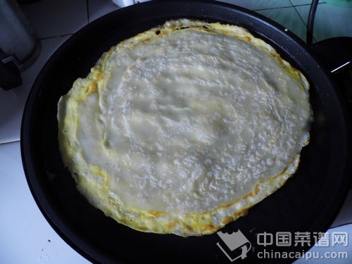 6.鸡蛋7、8分熟的时候翻面,喜欢饼皮焦一点的可以多煎会儿