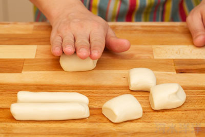 把面团分成两等份,其中一份放回保鲜膜内备用,把另外一份分成6个大小相等的剂子,用手将这些剂子滚成长度大约为8厘米的长条。在每个长条表面涂抹一层花生油,然后按照滚制的先后顺序依次排列。
