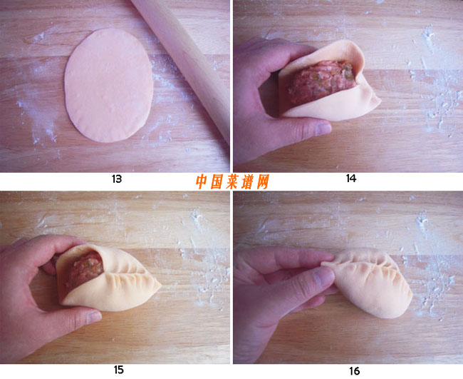 14.添上调好的榨菜猪肉的馅料,从一端用两边的面皮(图中肉馅的上、下两边)各捏出一个折口,然后向中间靠拢捏紧。