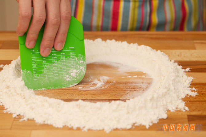 把面粉铺在面点案板上,用刮板在中间开一个直径大约是25厘米的窝,