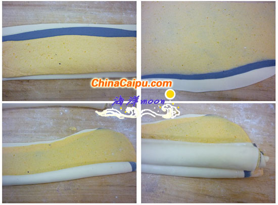 2、另把白色面团,南瓜面团和紫薯面团擀成薄片,叠加在一起,再次擀开。从一边卷起,不要卷到边。把两边卷起的长条叠加在上面。