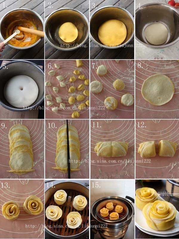 7.我的南瓜面的小剂子儿比白面小剂子儿分得稍大一些,这样做出来的玫瑰花中黄色多一些,如果想白色多一些,可将白面小剂子儿分大一些,想要黄白各半的话,就分一样大吧。