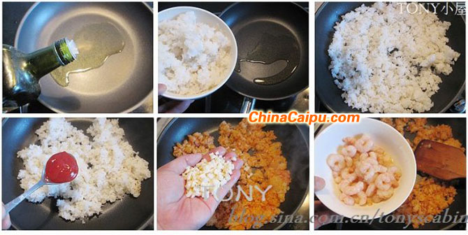 3.冷米饭下锅时会成块状,炒的时候可以用勺子压一压,不要垂直去把他们分开,那样会把米饭弄碎,刚做好的米饭是不能炒的,那样米饭水分含量太大一炒就粘连在一起,所以最好要用冰箱里冷藏过的隔夜饭。
