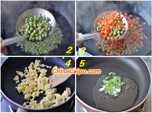 材料:米饭、植物油、精盐、胡萝卜、火腿、豌豆、鸡蛋、小葱