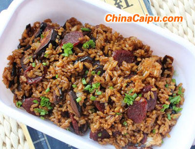 食材:腊肠1根,小葱适量,香菇,米饭一碗,生姜,生抽,老抽,糖,酒,油