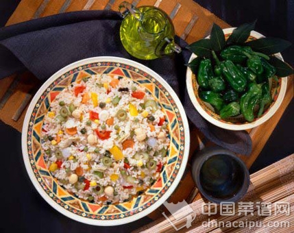 米饭的37种花样吃法、在锅中放少许橄榄油,将毛豆仁、玉米粒、青红椒粒、葱白粒和胡萝卜粒翻炒米饭的37种花样吃法分钟,盛起备用(用橄榄油炒出的米饭比较不会油腻,而且健康);