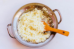 6 直至米粒完全被油包裹,倒入浸泡过大米的水