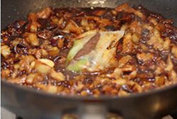 炸洋葱的过程中,将香菇切成小丁,香菇水留用