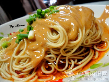 材料: 切面150克,麻酱一大匙,葱花一中匙,精盐半小匙,味精半小匙,熟色拉油一中匙,沸水500克。