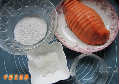 原料:木瓜半只水磨糯米粉50克冰糖35克糖桂花适量绿豆淀粉9克清水总共360克