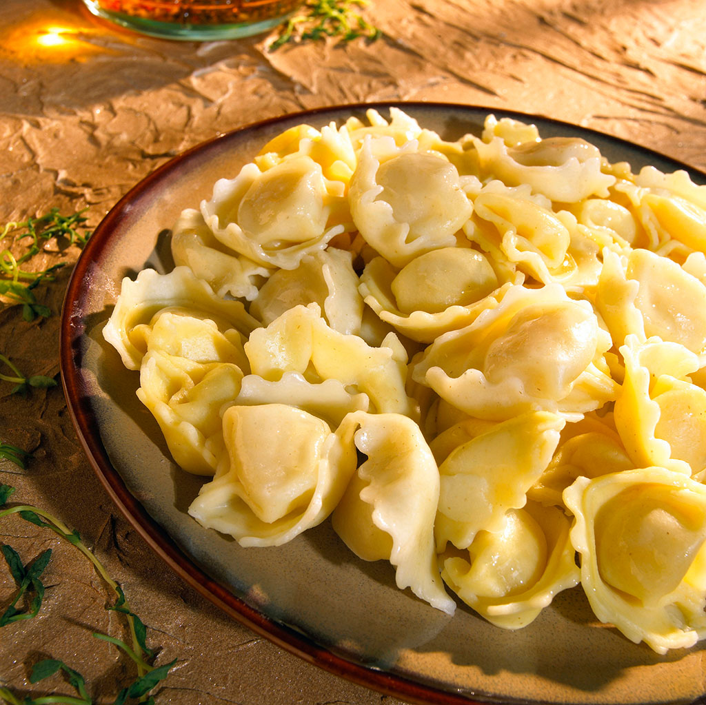 意大利饺子离不了奶酪。意大利饺子的馅料与中国的大相径庭,奶酪、洋葱、蛋黄和肉才是主料,有时也加些菠菜、番茄。他们包饺子时,会把面压成长条,一勺勺放好馅,在面的边缘沾上水,再用同样的一条面片合在一起压好,然后用刀一一切开,煮着吃。