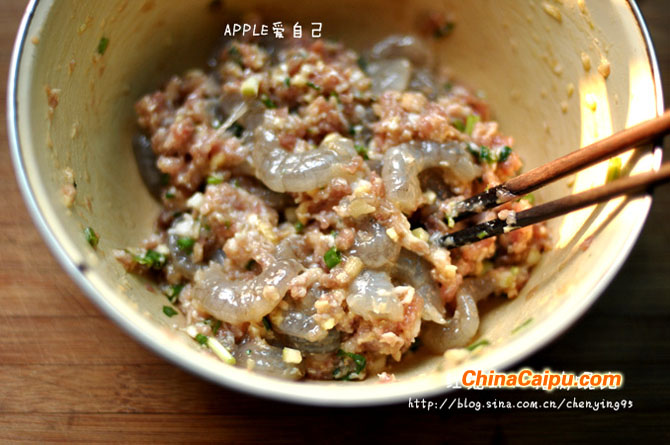 9、10、11、裹馄饨。每个馄饨取适量猪肉馅儿再放上1-2虾仁
