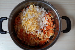 玉米切碎。胡萝卜切碎。马蹄切碎。全部混合一起