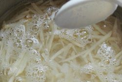洗好的土豆丝入开水锅中焯水,焯水后的土豆丝可过一遍凉水