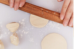 4 把切好的小面团沾上面粉,按压扁,再用擀面杖擀成四周薄、中间稍厚的圆形饺子皮