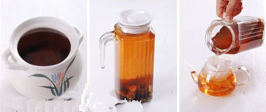 4.待稍凉一下倒入晾水杯里。可冰箱冷藏。喝时倒入茶壶或茶杯中时用茶包过滤一下。放入少许干桂花