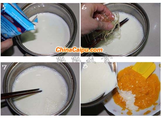 8、已经降温的1/3奶液倒入芒果泥中,用橡皮刮刀翻拌均匀;