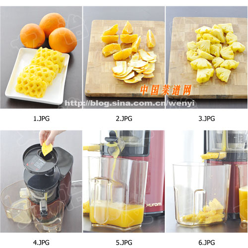 **用橙子榨汁只需要将橙皮去掉,如果有核去掉可以,怕麻烦不去掉也可以。但菠萝中间的芯儿一定要切掉不用,菠萝芯的纤维比较粗,卡住出渣口儿的话,影响榨汁效果。