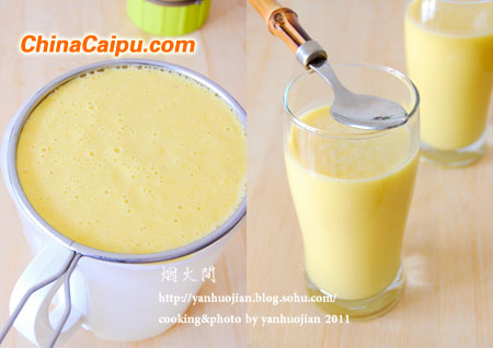 3、 将打好的玉米浆过筛,用勺子按压漏网中的玉米茸,使玉米汁尽量多的过滤出来就可以了(我后来改用纱布包裹住挤压,这样可以最大程度将汁过滤出来)。最后可以根据自己口味在玉米汁里加入白糖或蜂蜜增加甜味,如果想要更加香浓,可以加点淡奶油,会让玉米汁的奶香味更足。