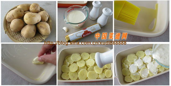 材料:土豆、动物性淡奶油、黄油、蒜瓣、盐和黑胡椒粉。