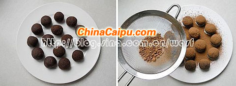6、将凝固的巧克力分成15克等份( 每个大约10克),用手揉成球, 之后用细筛筛上可可粉,再次放入冰箱,彻底凝固即可。