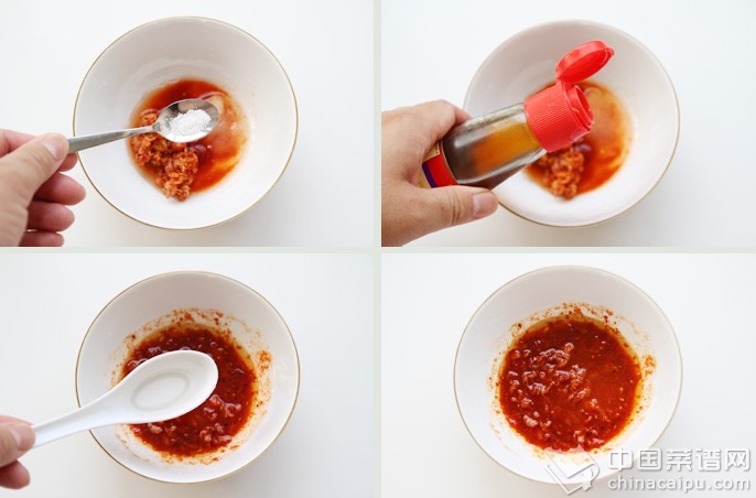 3.找一个空碗加入一勺韩式辣椒酱、切碎的辣白菜、苹果醋、白糖、盐、生抽、香油、白梨汁搅拌均匀。