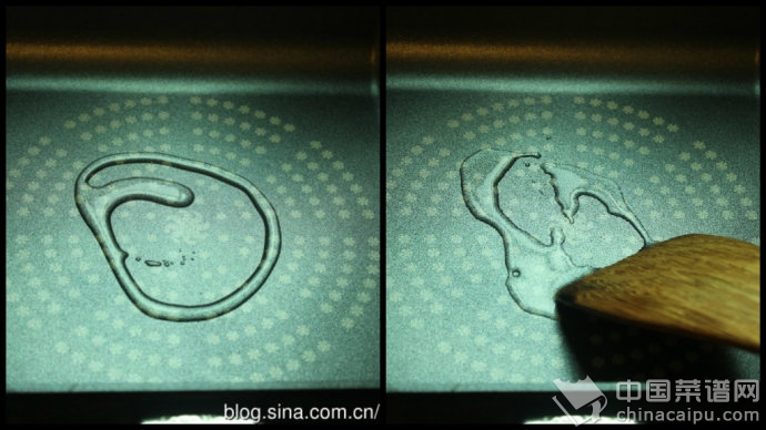 5、在方形煎蛋锅中倒入少量食用油,用木铲将食用油均匀推向锅的各个角落