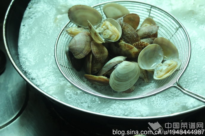 3、待锅中汤沸,蛤蜊开壳,用捞勺将蛤蜊捞出备用