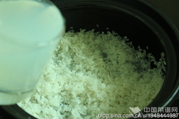 4、将2杯大米洗净后倒入砂锅中,加入2杯蛤蜊汤