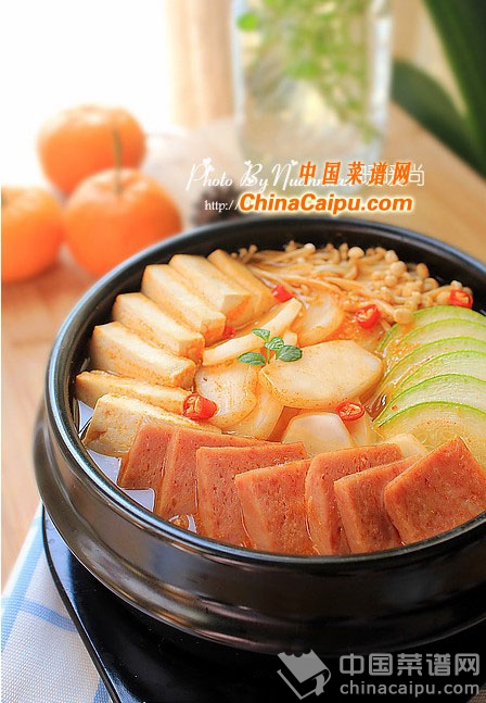 2.食材中的午餐肉可以换成五花肉、牛肉等,蔬菜也可以换成自己喜欢吃的。为了造型漂亮在煮的时候我把所有食材一同放进锅子里了,自己煮的时候尽量先放年糕、豆腐等耐煮的食材,比较容易熟的食材后方。