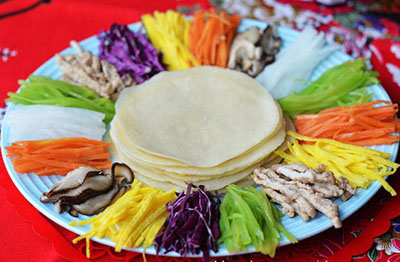 摆盘:薄饼摆在盘子中间,周围按照颜色搭配摆上所有的配菜即可