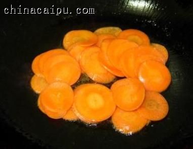 5、开始下锅了,先烧热油锅,将红萝卜翻炒一下;