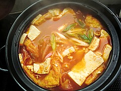 材料:韩式泡菜150克,豆腐200克,火腿100克,香菇3朵,油豆腐适量。