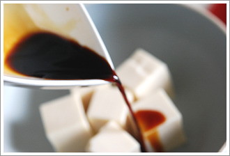 5、再放入一点香油后混合,浇汁到切好的豆腐中。