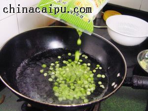 2、此菜选用的青豆是可即食的,因此汆烫和烹煮时间都不宜过长,以免青豆发黄变色;如果选用生青豆的话,应尽量将其焯熟,才可下锅烹煮。