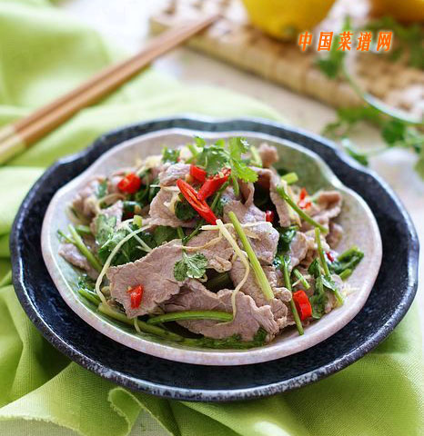 6.把姜丝、香菜段放入装牛肉的盘子里,倒入凉透的泰式酸辣汁拌匀即可。