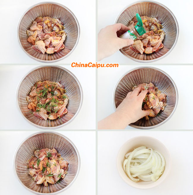 1.鸡腿肉切成大小适中的块,用五香粉与新鲜迷迭香抓匀腌制20分钟,洋葱切丝备用。