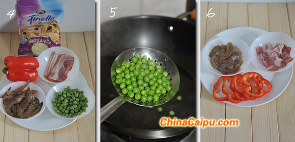 6. 虾剥壳成虾仁,用几滴料酒和一点点盐抓匀腌制。培根切小块,彩椒切圈。