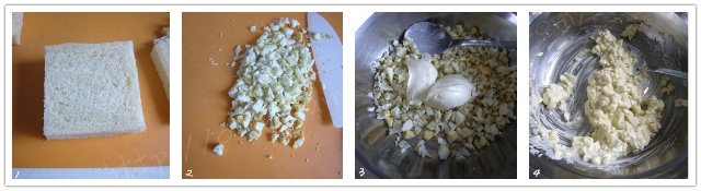 1、【图1-4】取吐司片把四边都切除,鸡蛋蒸熟去壳切成碎,放入盆中加入适量蛋黄酱和黑胡椒粉搅拌匀。