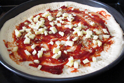 8 在生胚上均匀的抹上披萨酱,撒上披萨草