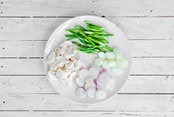 蔬菜洗净沥干水,口蘑切片、芦笋切段、小洋葱与蒜头切片备用